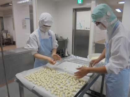 ☆今日は「和食の日」とされているため、郷土料理給食としました。今月は熊本県天草地方の「せんだご汁」という料理が出ます。さつまいもの団子が入った汁物です。早速、給食室では調理員さんがさつまいもの団子を手作りしてくださっています。