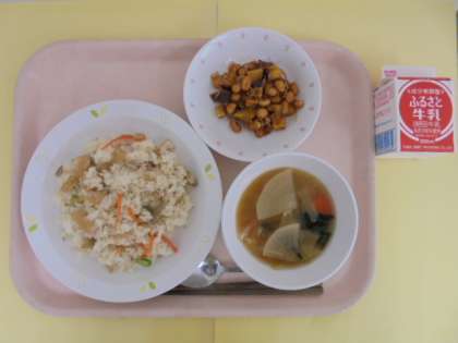 かやくごはん 牛乳 大根のみそ汁 大豆とさつまいもの甘辛あげ