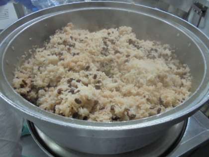 ☆今日は「開校記念日給食」と題して、おめでたい日に食べる「お赤飯」と、子どもたちに人気の「鶏肉のからあげ」が出ました。お赤飯は、お豆の形が崩れないように、調理員さんが丁寧に混ぜて各クラスの食缶に入れてくださいました。