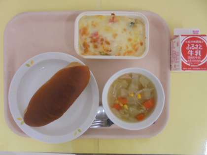 黒砂糖パン 牛乳 ポテトグラタン キャベツスープ