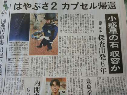 いよいよ、12月に入りました。今日は、小惑星探査機「はやぶさ2」のお話をします。6年前に地球を出発し、遠く離れた小惑星「リュウグウ」に到着して、砂や石を集めることに成功しました。その後、地球へと向かい、リュウグウの資料が入ったカプセルが「はやぶさ2」から切り離され、昨日オーストラリアの砂漠地帯に着地したのです!