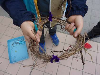 土曜日に1年生は取っておいたアサガオの蔓を使ってリースづくりをしました。土曜日だったので保護者の方にたくさんお手伝いいただきましたが、どの子も楽しそうにリース作りに取り組みました。保護者の皆様、ありがとうございました。