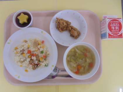 三色ピラフ 牛乳 ABCスープ フライドチキン ぶどうゼリー