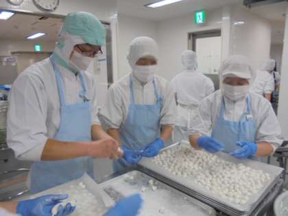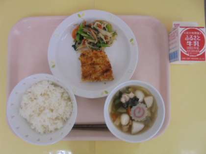 ☆今日から3学期の給食が始まりました。初日“お正月給食”と題して、おせち料理の「松風焼き」と「白玉雑煮」を出しました。白玉もちは調理員さんが一つずつ丸めて作ってくださいました。