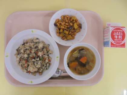 五目ごはん 牛乳 白菜のみそ汁 大豆とさつまいもの甘辛あげ