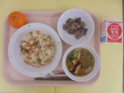 かやくごはん 牛乳 さつまいものみそ汁 くじらの立田揚げ ぽんかん