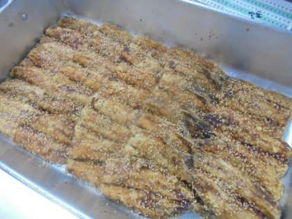 ☆今日は「いわしのかば焼き丼」が出ました。いわしをカリッと揚げて、甘辛たれを絡め、仕上げにごまをふりました。細い骨がありますが、油で揚げているので骨も食べることができます。骨を気にすることもいましたが、よくかんでしっかり食べていました。