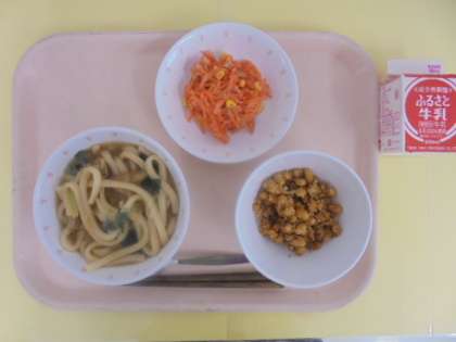 五目うどん 牛乳 大豆とじゃこの甘辛揚げ にんじんサラダ