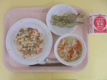 ☆今日は郷土料理給食でした。今月は兵庫県の「ばち汁」が登場しました。兵庫県ではそうめん作りが盛んです。そうめんを作る過程で、そうめんが三味線の「ばち」の形に似ていることからこの名前がついたそうです。子どもたちも、そうめんが入っていることに喜び、たくさん食べていました。