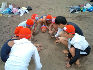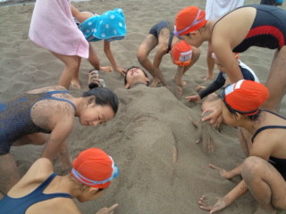 泳いだ後の休憩時間。砂遊びで大はしゃぎです。