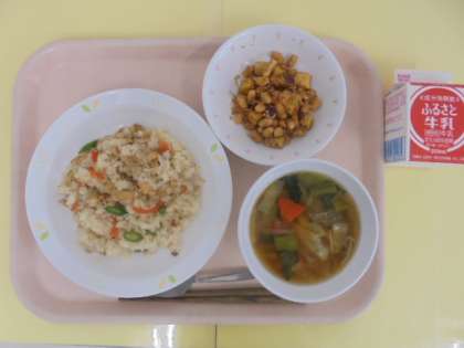 子ぎつねごはん 牛乳 野菜のみそ汁 大豆とさつまいもの甘辛揚げ