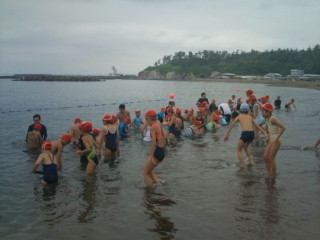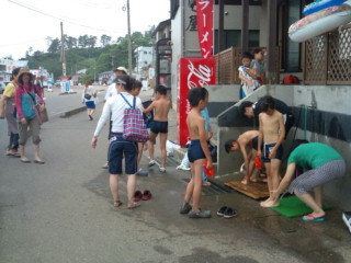 子どもたちの体は砂だらけです。帰る前に、海で砂を落とします。民宿の前でも、シャワーを浴びます。