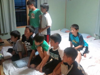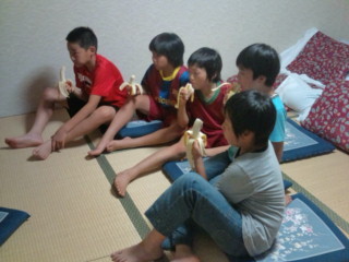 散歩に行こうと外に出たら雨が降ってきました。子どもたちは、部屋でバナナやトマトを食べたり、テレビを見たりしながら過ごしています。