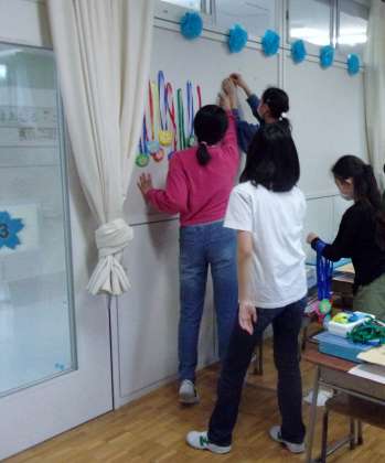 周りと声を掛け合って協力しながら机を運んだり、飾り付けをしたりしたおかげで、予定終了時間よりも1時間以上も早く準備が終わりました。