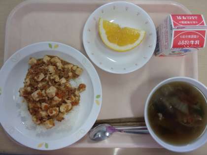 牛乳 マーボー豆腐どん 春雨スープ 美生柑