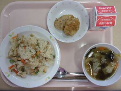 牛乳 たけのこご飯 さくさくつくね 春野菜のみそ汁
