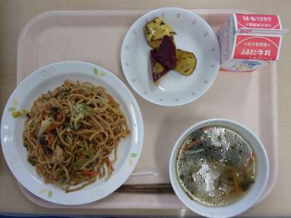 牛乳 ソース焼きそば 中華スープ 大学いも