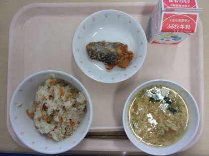 牛乳 かやくご飯 魚の竜田揚げ かき玉汁