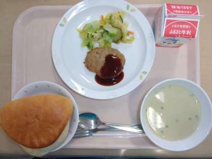 牛乳 ミルクパン ハンバーグ フレンチサラダ コーンポタージュ
