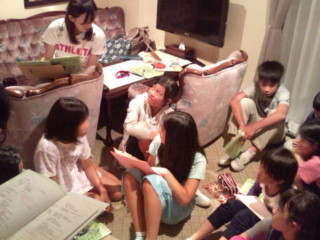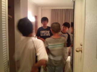 保健室になっているスイートルームで、班長会議を行いました。班長さんは部屋に戻ってみんなに報告します。