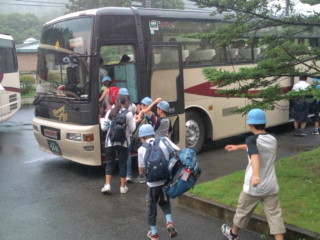 閉園式をすませ、思い出いっぱいのホテルを出発しました。小雨が降っています。