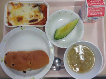 牛乳 ぶどうパン ムサカ レンズ豆のスープ メロン