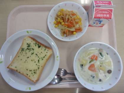 牛乳 ガーリックトースト クリームシチュー かみかみサラダ
