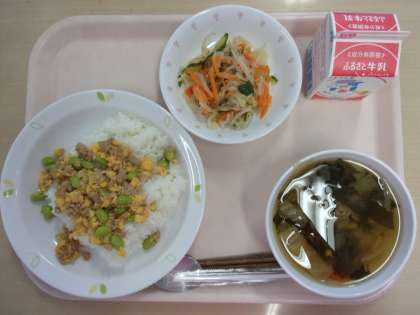 牛乳 三色丼 切り干し大根のサラダ 野菜味噌汁
