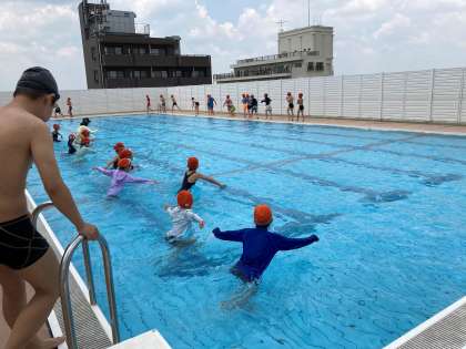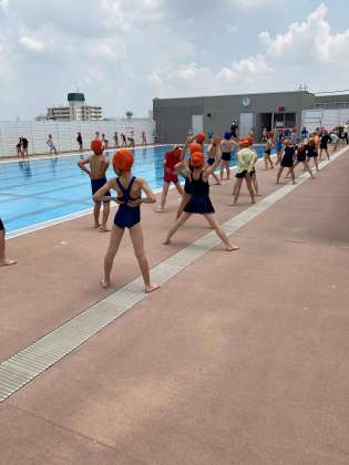 いよいよ夏の水泳が始まりました。トップバッターは2年生です。2クラスずつ行うのでちょっといつもより寂しい感じですが、みんな元気に水の中で運動しました。去年やっていないので初めての水泳です。「キャー」っと叫びたい気持ちをじっとこらえながら楽しく活動しました。