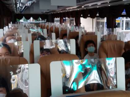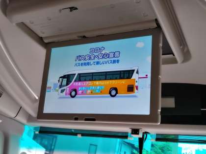 バスの中では、感染対策のビデオを見ました。座席にもアクリルボードが設置されており、安心です。