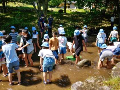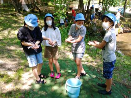 楽しみにしていた「鱒つかみ」が始まりました。生きている魚に触るのが初めてという子もいましたが、みんなで協力してつかまえました。