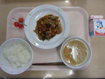 牛乳 ごはん けいちゃん焼き あんかけ汁 さくらんぼ
