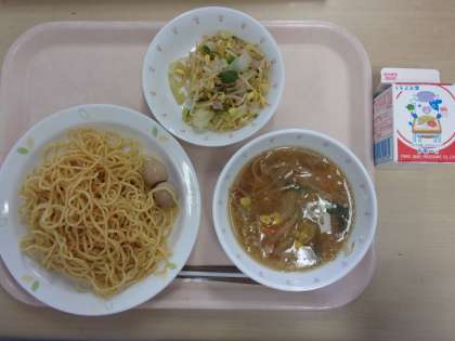 牛乳 みそラーメン 煮卵 豆もやしのサラダ