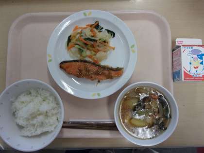 牛乳 ごはん 魚の七味焼き みそドレサラダ 田舎汁