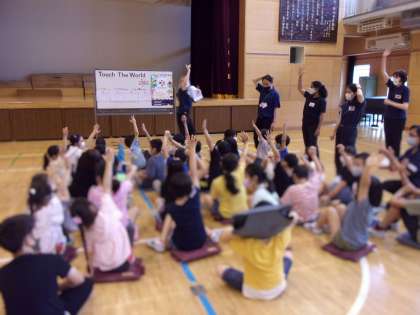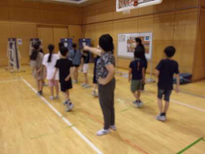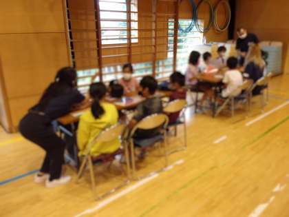 4年生は体育館で英語体験授業がありました。5人のネイティブティーチャーと一緒に、3つの体験コーナー(旅行代理店Travel Agency、校内案内School Directions、生活雑貨店Grocery Store)を学習していきました。
