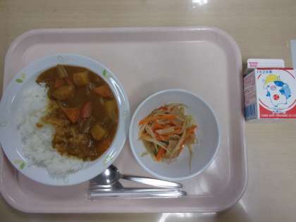 ☆今日から給食が始まりました。今日は子供たちから大人気のカレーライスです。みんな黙食でもりもりと食べていました。教室を回っていると、無言でグッドサインをくれた子もいて、嬉しかったです。2学期も給食室一同安全・安心のおいしい給食の提供、感染症対策に努めて参りたいと思います!