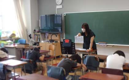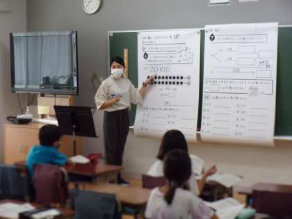 オンラインと教室にいる子供たちと双方でクイズを楽しんだり、オンライン上でも挙手して算数の問題の答えを発表したりしている様子が見られました。また、タブレット端末やデジタル教材を積極的に活用し、意欲的に社会の学習に取り組む様子も見られました。