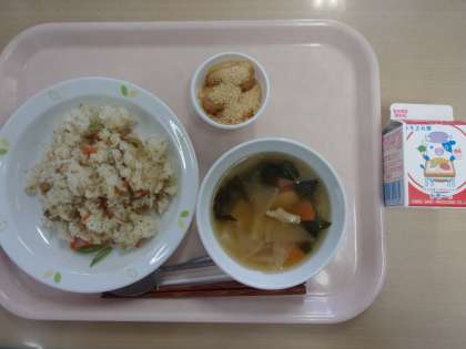 牛乳 かやくご飯 里芋汁 月見団子