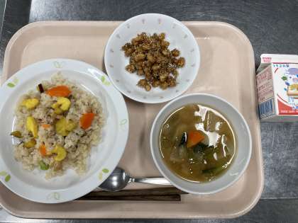 牛乳 秋の香ごはん 野菜の味噌汁 大豆とじゃこの甘辛揚げ