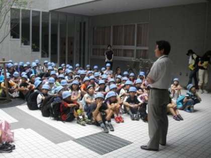 今日は、いよいよ遠足当日です。朝、下高井戸駅に行った所で雨が降り出したときには子どもたちから「水遊びできるの〜?」や「てるてるぼうず作ってくれば良かった−。」などの声が聞こえましたが、府中市郷土の森公園に着いたときには快晴でした。