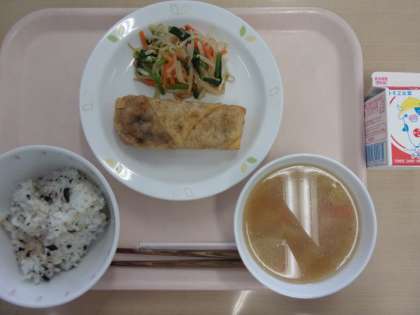 牛乳 わかめごはん 春巻き ナムル 中華スープ