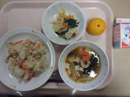 牛乳 こぎつねごはん 味噌ドレサラダ 五目汁 みかん