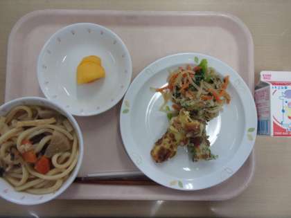 牛乳 五目うどん ちくわの二色揚げ 野菜のごまあえ 柿