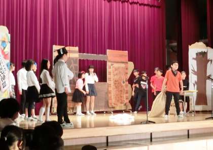 5年生は、「嵐の中の子供たち」という劇で、町に取り残された子供たちが力を合わせて困難に立ち向かうお話です。発表会当日は、練習してきた中で一番の演技を見せてくれて、5年生の底力を見た気がしました。大道具や小道具も工夫されていて、さすがの出来栄えでした。