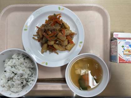 牛乳 わかめごはん 金平煮 大根の味噌汁