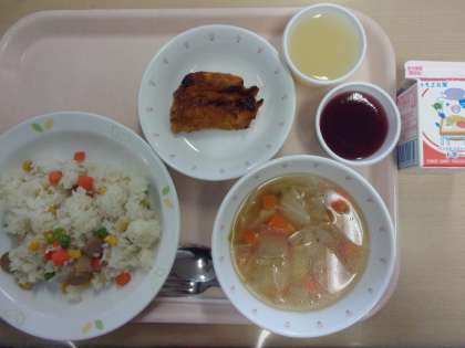 牛乳 三色ピラフ タンドリーチキン コンソメスープ セレクトデザート(ぶどうゼリーorりんごゼリー)