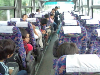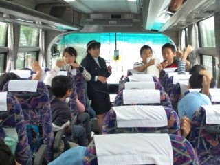 さっそくバスレクが始まりました。漢検クイズや歌で盛り上がっています。