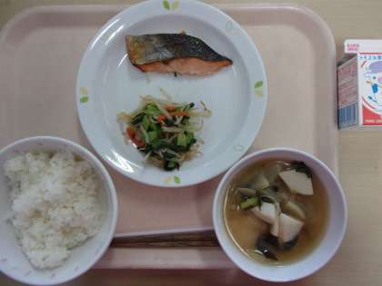 牛乳 ごはん 鮭の塩焼き お浸し 味噌すいとん汁