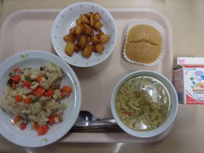 牛乳 中華おこわ スパイシーポテト たまごスープ ふわふわ蒸しパン