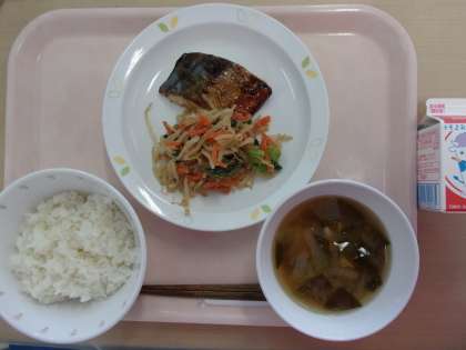 牛乳 ごはん 魚の照り焼き 野菜のごまだれかけ さつまいもの味噌汁